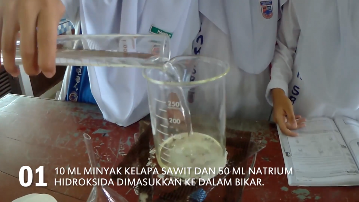 Apabila larutan natrium hidroksida pekat ditambahkan ke dalam minyak kelapa sawit, hidrolisis akan berlaku iaitu minyak akan diasingkan kepada asid lemak dan gliserol. Asid lemak kemudiannya bergabung dengan ion natrium untuk membentuk sabun. Oleh itu, sabun sebenarnya adalah garam natrium asid lemak.